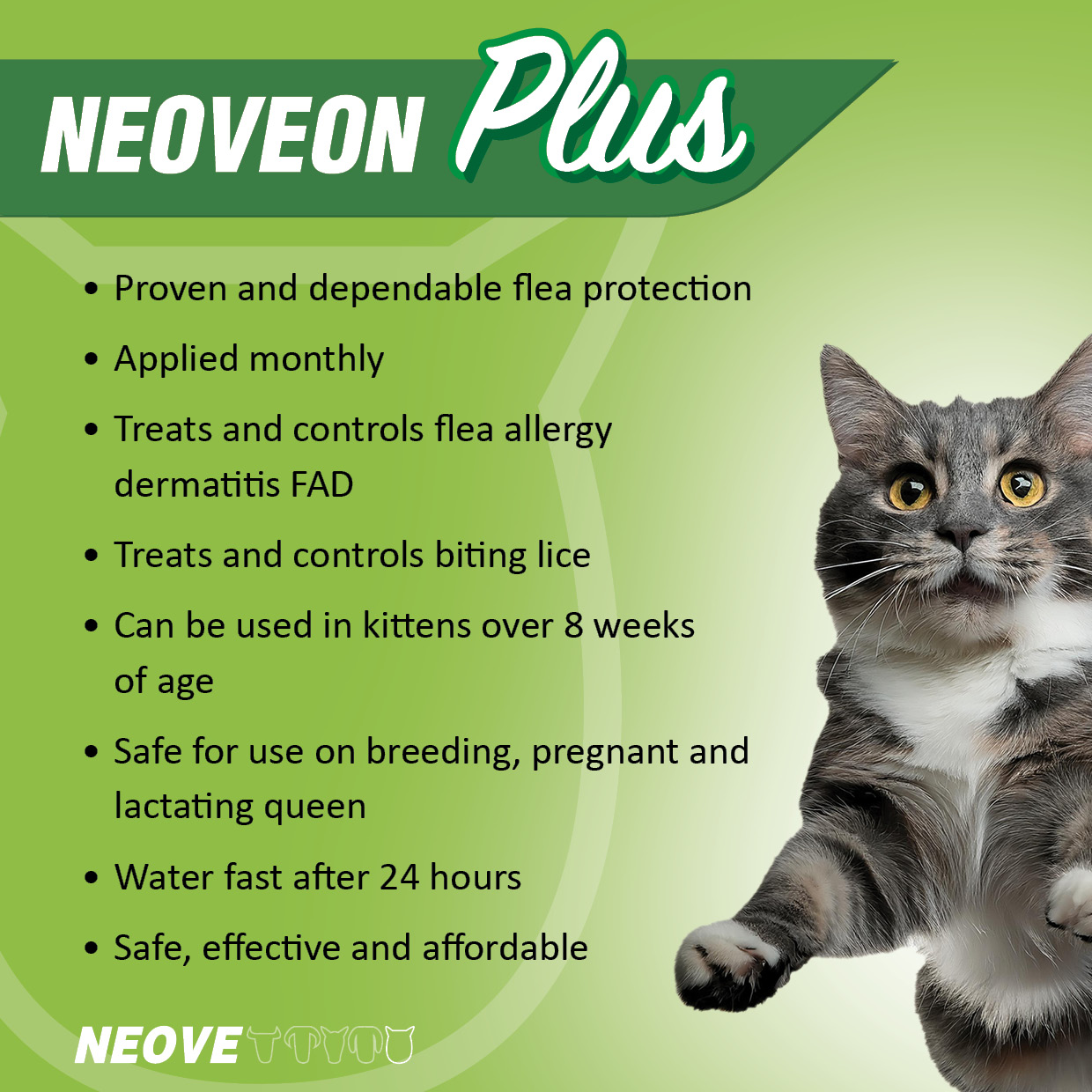 Neoveon Plus is proven safe for use on kittens aged eight weeks and older, as well as pregnant and lactating cats, making it an appropriate choice for any cat owner. This spot-on treatment is easy to apply and offers lasting protection, stopping flea development in its tracks. With Neoveon Plus, you can confidently protect your cats from fleas and the discomfort they cause, ensuring a happy, itch-free environment for your furry friends.