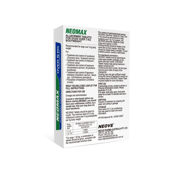 - For control of gastrointestinal worms: For dogs over 12 weeks of age and weighing over 5kg, NEOMAX Allwormer Tablets for Dogs (Over 5kg) should be administered orally every 3 months. For dogs under 5kg, use NEOMAX Allwormer Tablets for Small Dogs and Puppies (0.5-5kg).