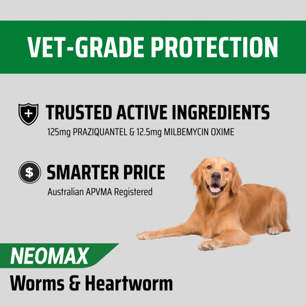 NEOMAX Allwormer is a broad-spectrum, once-a-month wormer designed to keep your dog safe from internal parasites. It provides the same level of protection as leading brands, covering heartworm and all major intestinal worms.