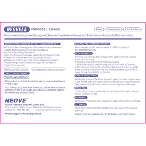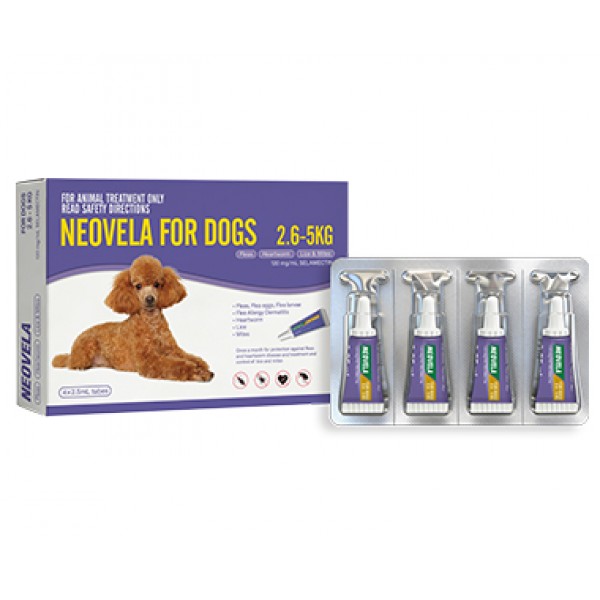 NEOVELA For Dogs is a convenient, once-a-month spot-on treatment designed to provide broad-spectrum protection. It shields your dog from fleas, heartworm, mites and lice in a single, easy application.