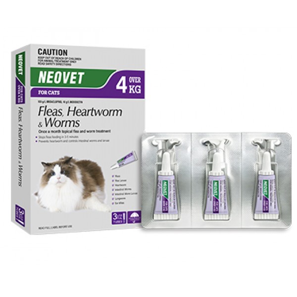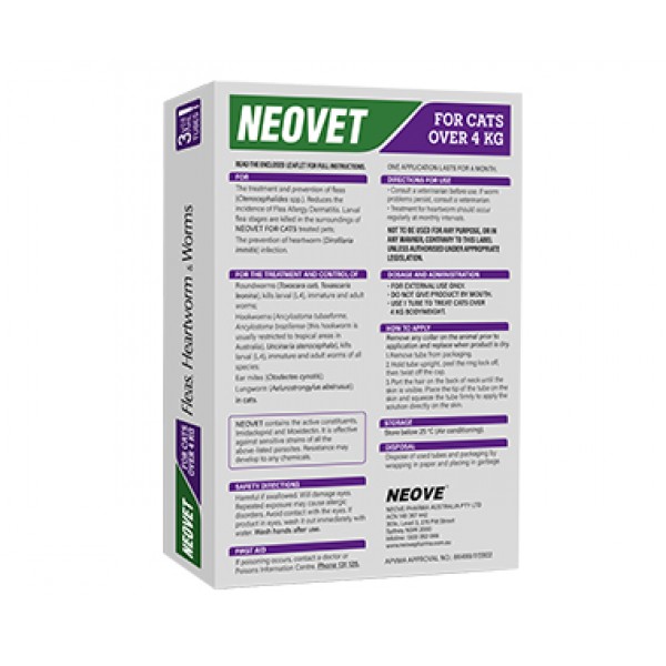 NEOVET For Cats is a comprehensive, once-a-month spot-on treatment designed to protect your cat from internal and external parasites. It shields your cat from fleas, heartworm, intestinal worms, and lungworm in a single, easy application.